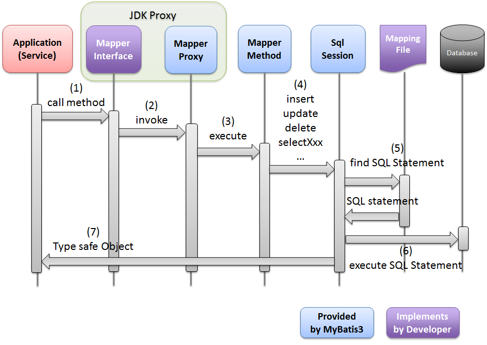 アプリケーション(Service)は、 DIコンテナによって注入されたMapperオブジェクト(Mapperインターフェースを実装したProxyオブジェクト)のメソッドを呼び出す。
