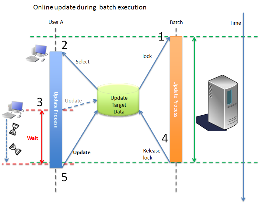 User Aが更新要求をするが、Batchにロックされているため、更新が待たされる。
