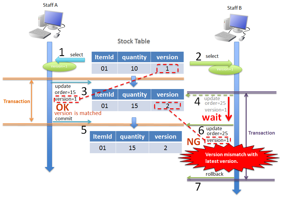 public class Stock implements Serializable { private static final long serialVersionUID = 1L; private String itemCode; private int quantity; // (1) private long version; // omitted }