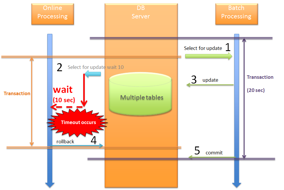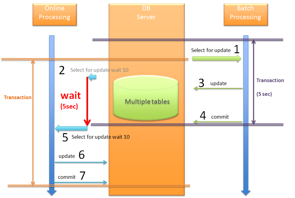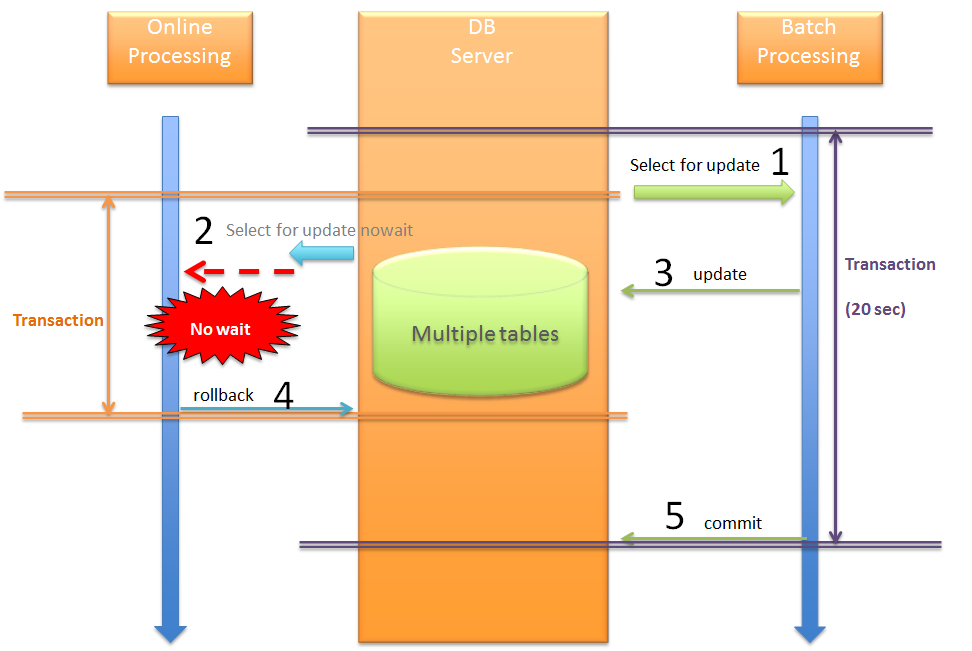 ここでは、バッチ処理によってロックされているデータに対して、オンライン処理で更新する例を示す。