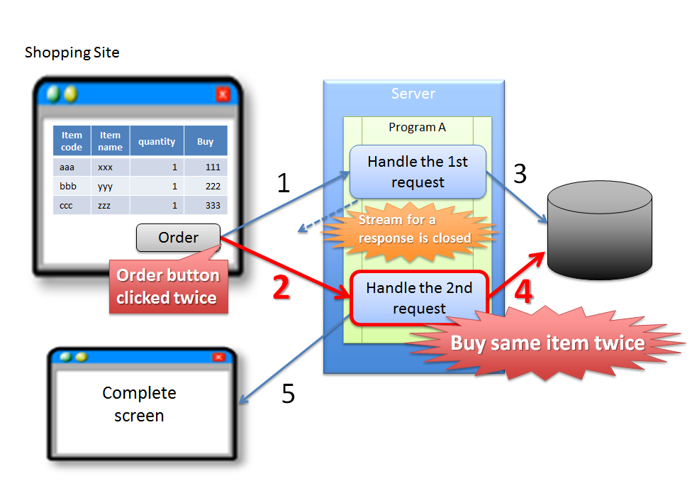 (1) 購買者が、商品購入画面で注文ボタンをクリックする。 (2) (1)のレスポンスが返る前に、購買者が誤って注文ボタンをもう一度クリックする。 (3) サーバは、(1)のリクエストで受けた商品の購入処理をDBに対して反映する。 (4) サーバは、(2)のリクエストで受けた商品の購入処理をDBに対して反映する。 (5) サーバは、(2)のリクエストで受けた商品の購入完了画面を応答する。Warning