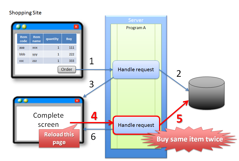 (1) 購買者が、商品購入画面で注文ボタンをクリックする。 (2) サーバは、(1)のリクエストで受けた商品の購入処理をDBに対して反映する。 (3) サーバは、(1)のリクエストで受けた商品の購入完了画面を応答する。 (4) 購買者が、誤ってブラウザのリロード機能を実行する。 (5) サーバは、(4)のリクエストで受けた商品の購入処理をDBに対して反映する。 (6) サーバは、(4)のリクエストで受けた商品の購入完了画面を応答する。Warning