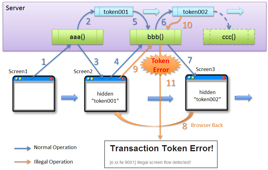 (8) クライアントでブラウザの戻るボタンをクリックする。 (9) クライアントから戻った画面にあるトランザクショントークン(token001)を含めたリクエストを送信する。 (10) サーバは、サーバ上に保持しているトランザクショントークン(token002)と、クライアントから送信されたトランザクショントークン(token001)が同一かチェックする。値が同一ではないので、 不正なリクエストと判断し、トランザクショントークンエラーとする。 (11) サーバは、トランザクショントークンエラーが発生した事を通知するエラー画面を応答する。