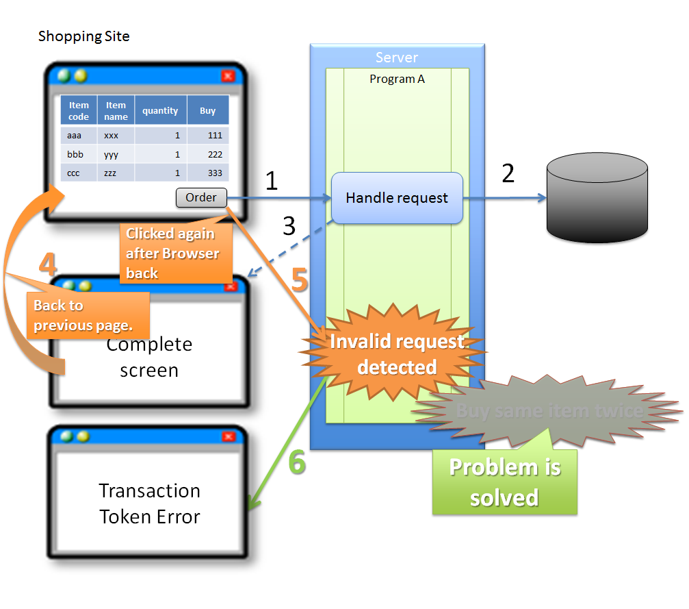 (1) 購買者が、商品購入画面で注文ボタンをクリックする。サーバ上で保持しているトランザクショントークンと、クライアントから送信されたトランザクショントークンが一致するため、商品を購入する処理を実行する。このタイミングで、サーバ上で保持していたトランザクショントークの値が破棄され、新しいトークン値に更新される。 (2) サーバは、(1)のリクエストで受けた商品の購入処理をDBに対して反映する。 (3) サーバは、(1)のリクエストで受けた商品の購入完了画面を応答する。 (4) 購買者が、ブラウザの戻るボタンを使って購入画面を再度表示する。 (5) 購買者が、ブラウザの戻るボタンを使って表示した購入画面で注文ボタンを再度クリックする。クライアントから送信されたトランザクショントークンは既に破棄された値のため、トランザクショントークンエラーとなる。 (6) サーバは、トランザクショントークンエラーが発生した事を通知するエラー画面を応答する。