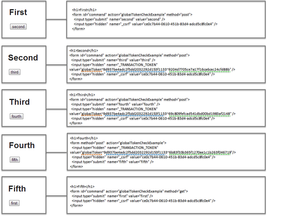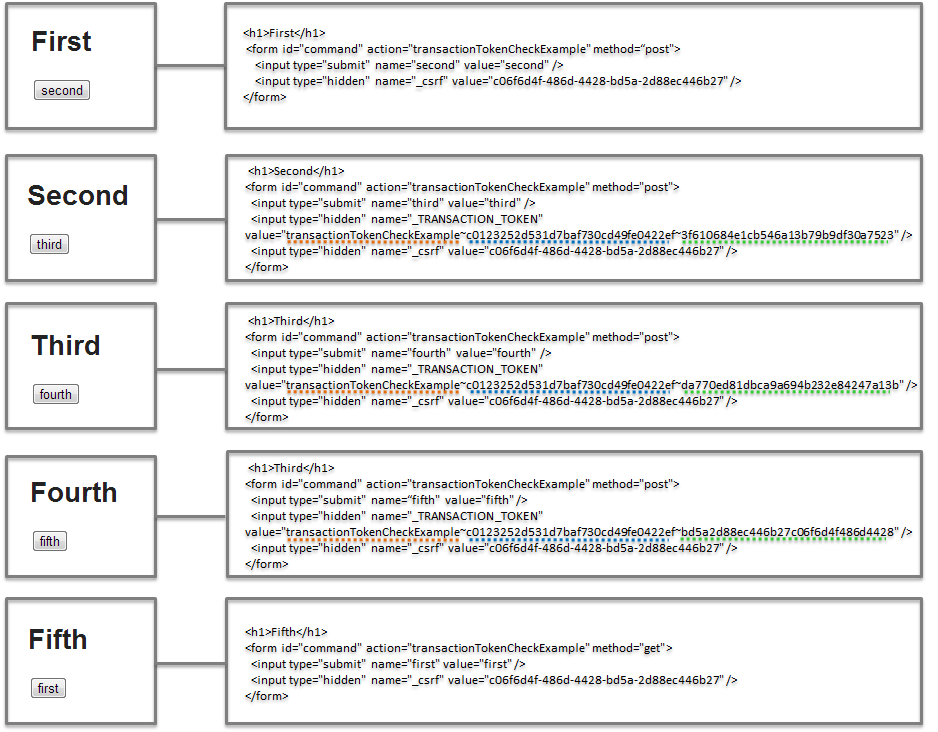 thirdView.html<h1>Third</h1> <form method="post" th:action="@{/transactionTokenCheckExample}"><!-- (1) --> <input type="submit" name="fourth" value="fourth"> </form>