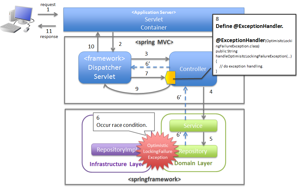 @ExceptionHandlerアノテーションを使い、アプリケーションコードで例外ハンドリングを行う。 |