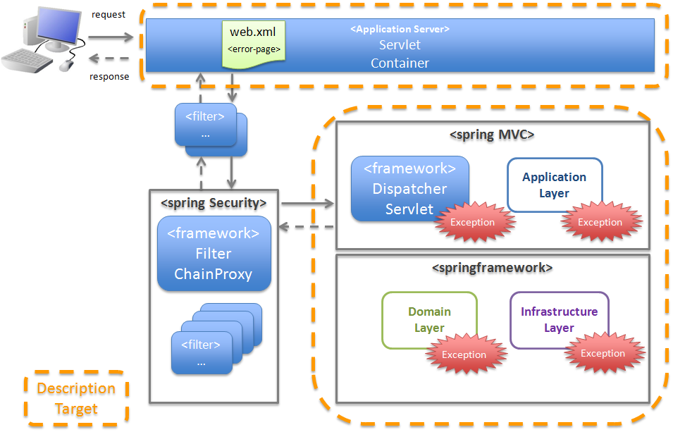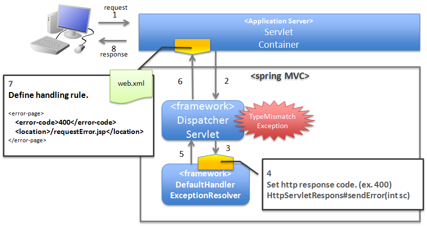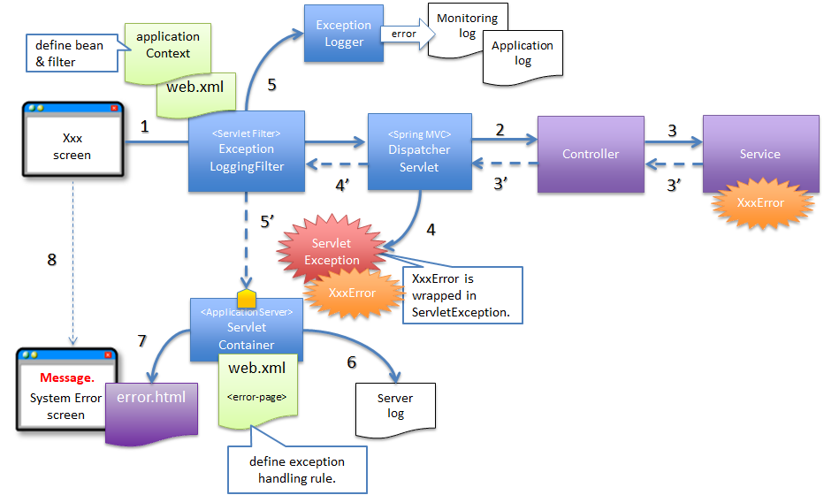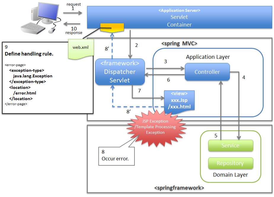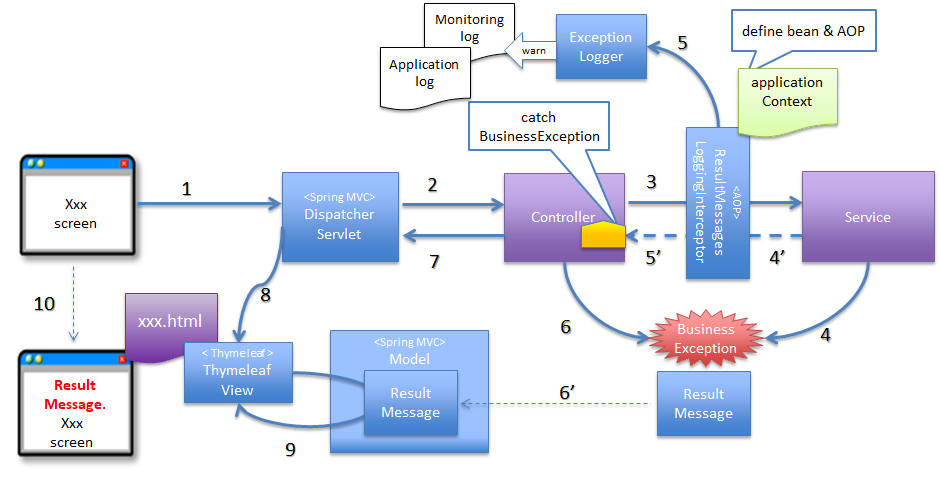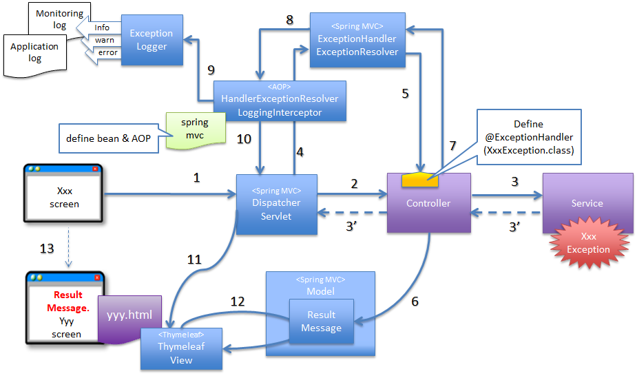 本節では、Spring MVC配下の処理で発生する例外のハンドリングについて説明する。説明対象は、以下の通りである。