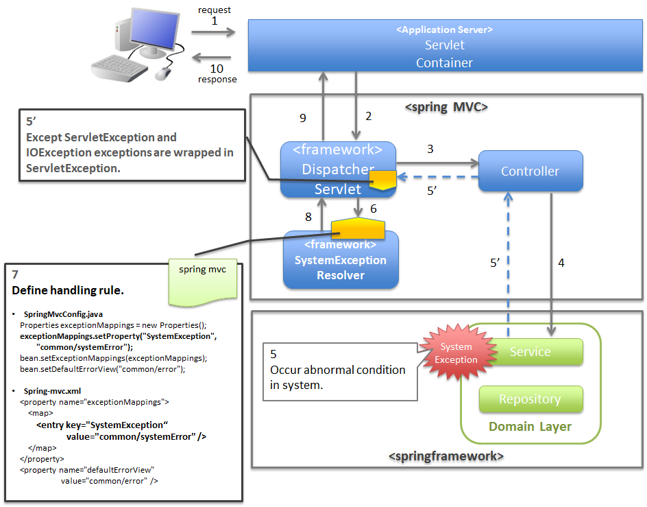 WebMvcConfigurerインタフェースを実装(もしくは<mvc:annotation-driven>を指定)した際に、自動的に登録されるクラスと共通ライブラリから提供しているSystemExceptionResolverを使用する。詳細は、サーブレット単位でフレームワークがハンドリングする場合の基本フローを参照されたい。