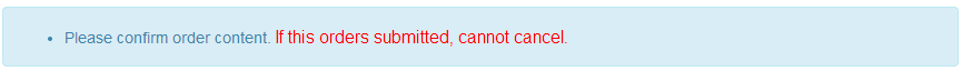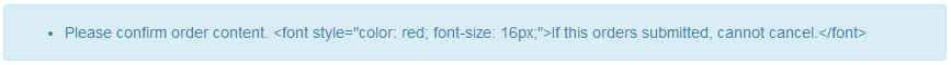 i.xx.yy.0001 = Please confirm order content. <font style="color: red; font-size: 16px;">If this orders submitted, cannot cancel.</font>