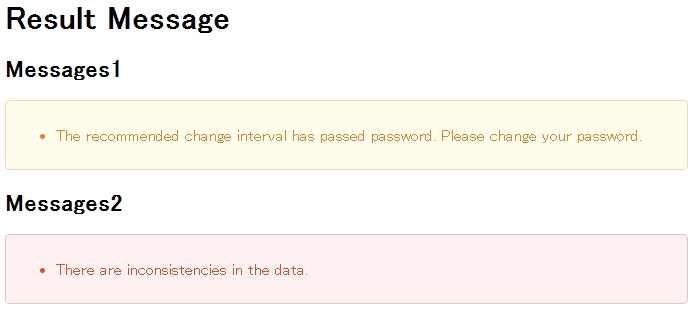 ResultMessagesオブジェクトとは異なり、メッセージタイプの情報をもたないため、messagesType属性で、明示的に、メッセージタイプを指定する必要がある。 |
