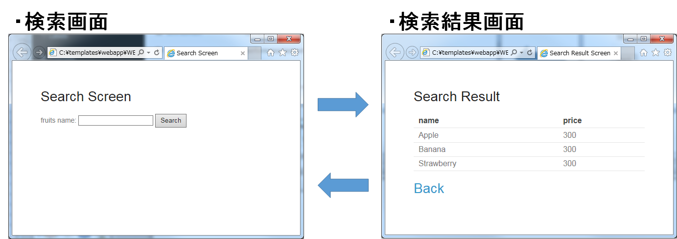 (1)xmlns宣言を追加し、プロセッサに付与する名前空間(”th”)を定義する。この定義は無くても構わないが、定義が無い場合Eclipse等のIDEによるHTML構文バリデーションで警告される為、記述する事を推奨する。(2)<link>要素にth:href属性を追加する。th:href属性のようにHTMLの属性に”th:”を付加した属性プロセッサは、テンプレートの解釈時に対象のHTML属性値を上書きする。th:href属性値には、リンクURL式@{}を用いている。リンクURL式は、指定されたパスにWebアプリケーションのコンテキストパスを付加した値を生成する。(3)<form>要素にth:action属性を追加する。th:action属性値には、リンクURL式@{}を用いている。(4)<form>要素にth:object属性を追加し、<form>要素内からアクセスするプロパティを格納したオブジェクトを指定する。th:object属性値には、変数式${}を用いThymeleafのコンテキストに格納したオブジェクトを参照する。変数式中の記述は、SpELによって処理される。(5)<input>要素にth:field属性を追加し、サーバサイドで保持されているデータが有る場合に出力する。th:field属性値を<input>要素に適用すると、id属性、name属性、value属性が付加される。th:field属性値には選択変数式*{}を用い、th:object属性で指定したオブジェクトのプロパティを参照している。これは変数式を利用し、${searchForm.fruitsName}と実装した場合と同様の結果を得る。選択変数式中の記述も変数式と同様にSpELによって処理される。検索結果画面