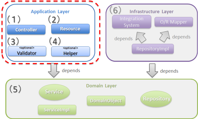 (6)インフラストラクチャ層で実装するモジュールは、アプリケーションの種類に依存しないため、本節での説明は割愛する。各モジュールの役割については「アプリケーションのレイヤ化」を、インフラストラクチャ層の開発については「インフラストラクチャ層の実装」を参照されたい。