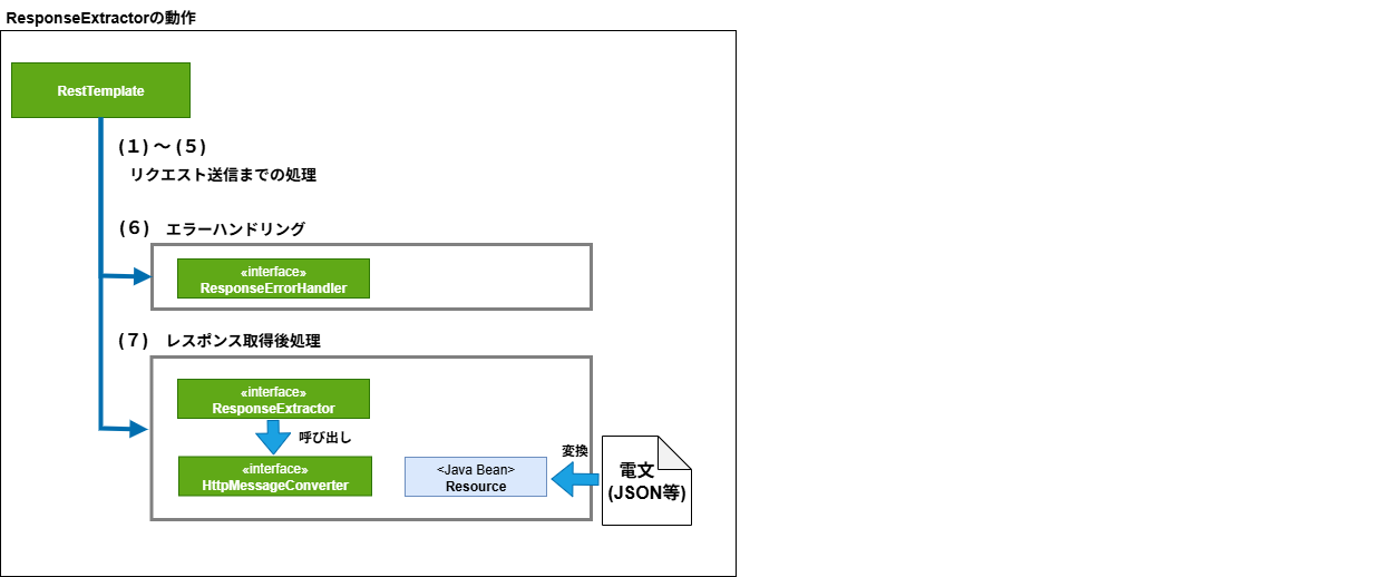 HttpMessageConverterの実装クラスを使用して、レスポンスボディに設定されている電文(JSON等)をJavaオブジェクトに変換する。リクエスト送信前処理と同様で