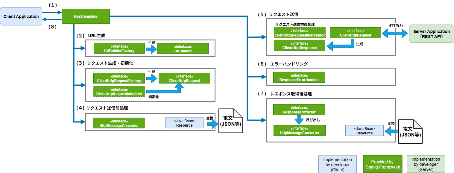 RestTemplateは、サーバとの通信処理を以下の3つのインタフェースの実装クラスに委譲することで実現している。org.springframework.http.client.ClientHttpRequestFactoryorg.springframework.http.client.ClientHttpRequestorg.springframework.http.client.ClientHttpResponse