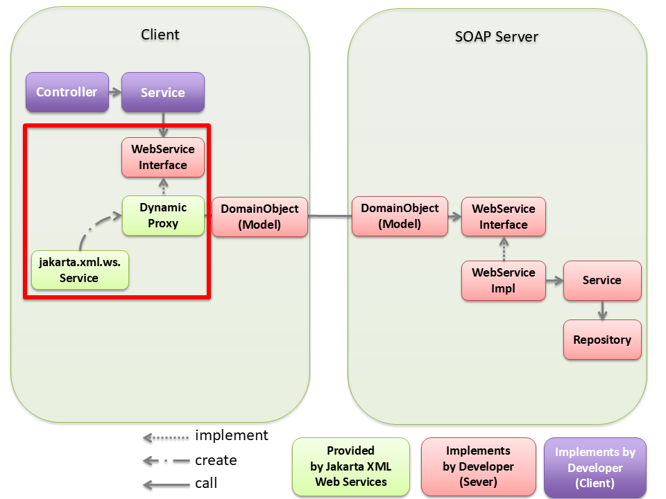 jakarta.xml.ws.Serviceが生成したWebServiceインターフェースの実装クラスである。この実装クラスがServiceにインジェクションされ、ServiceはWebServiceインターフェースのメソッドを呼び出すだけで、SOAP Web Serviceを利用した処理を行うことができる。