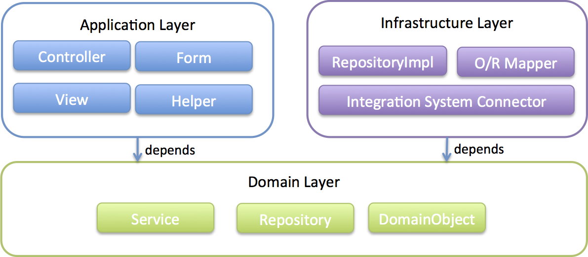 冒頭で説明したとおり、ドメイン層がコアとなり、アプリケーション層、インフラストラクチャ層がそれに依存する形となる。