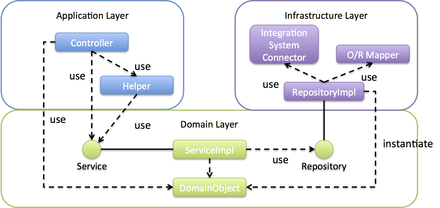 アプリケーション層、ドメイン層、インフラストラクチャー層はEric Evansの”Domain-Driven Design (2004, Addison-Wesley)”で説明されている用語である。ただし、用語は使用しているが以後”Domain-Driven Design”の考えにのっとっているわけではない。