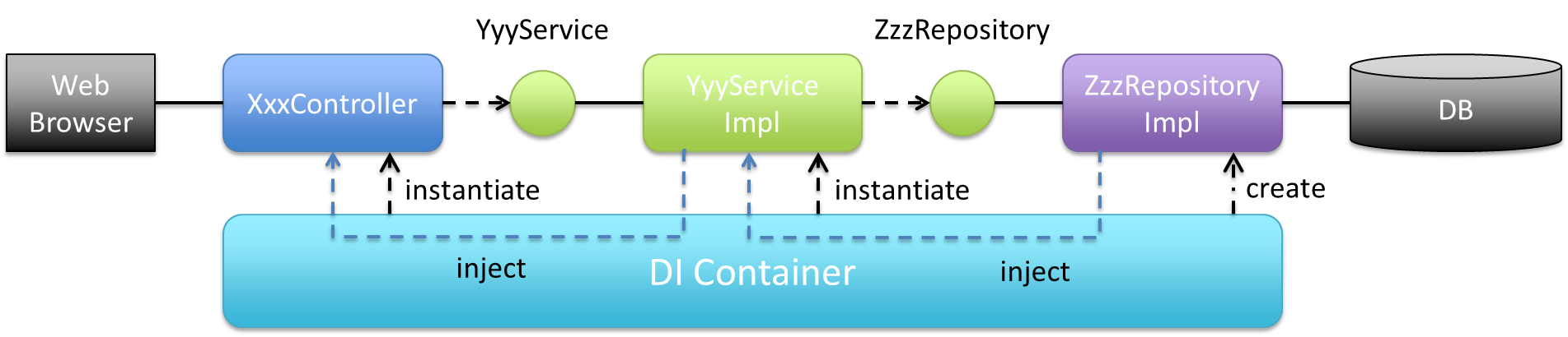 RepositoryImplの実装はRepositoryインタフェースによって隠蔽されるため、ドメイン層のコンポーネント(Serviceなど)では、どのようにデータアクセスされているか意識しなくて済む。