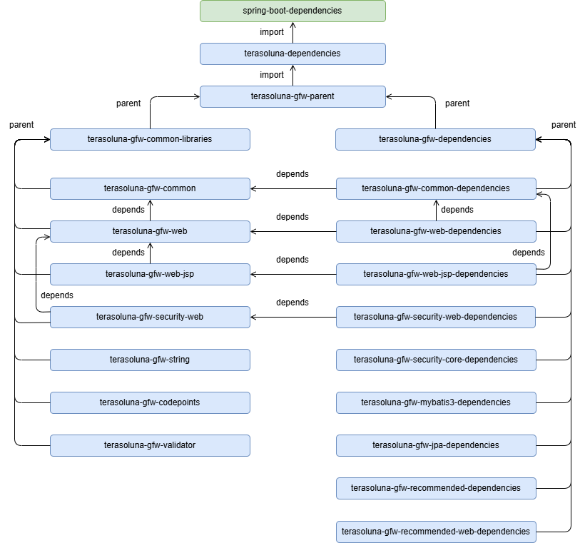 terasoluna-dependenciesおよびterasoluna-gfwの依存関係を以下に示す。