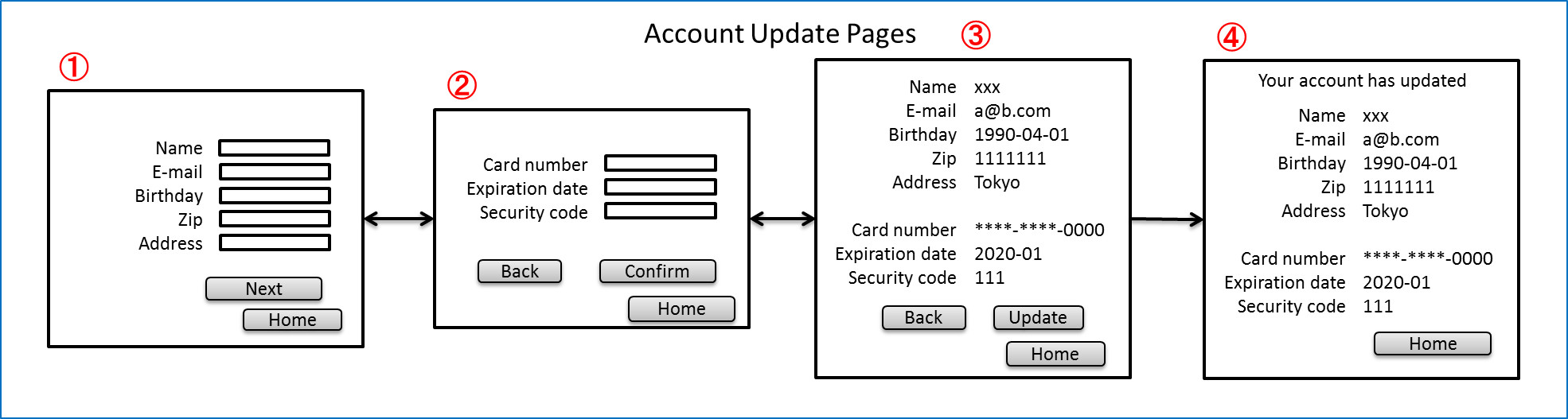 Account Update Pagesの各画面で「Home」ボタンを押すと、⑤の画面に遷移する