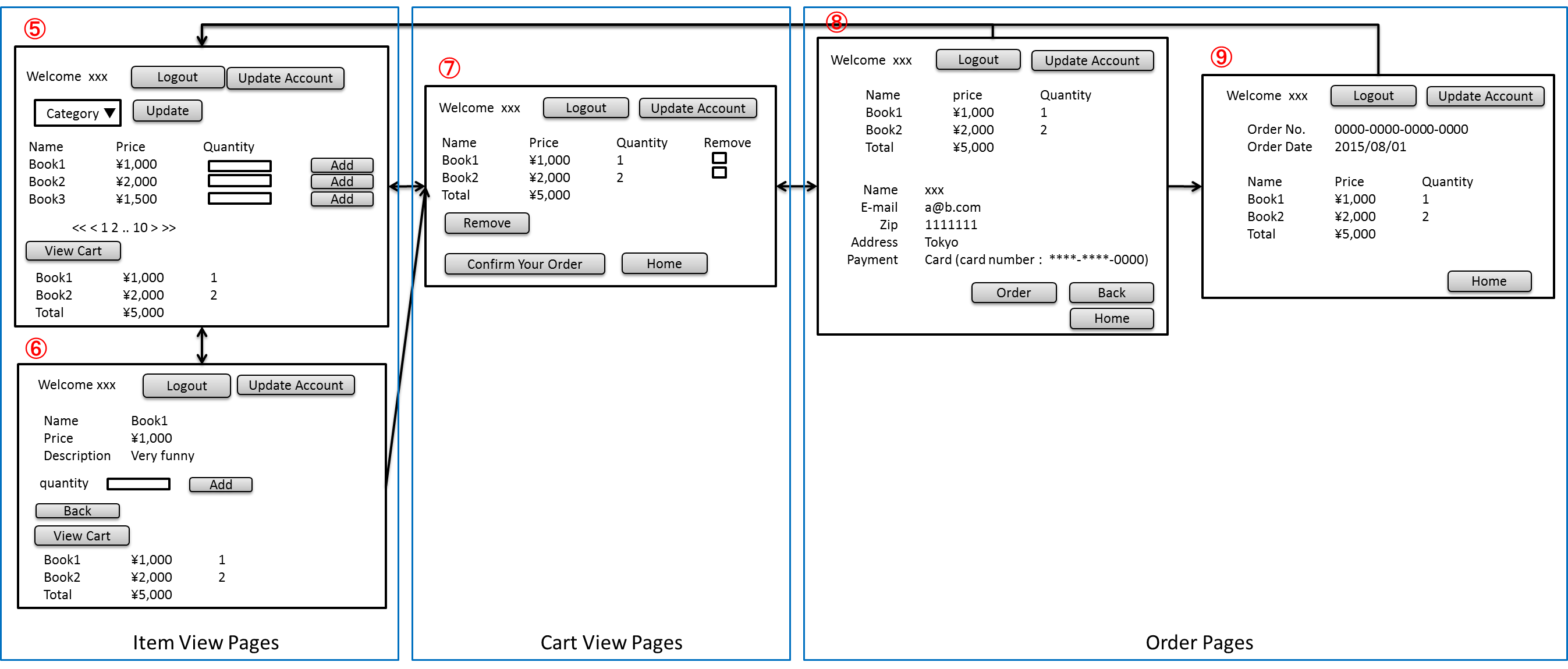Item View Pages、Cart View Pages、Order Pagesの各画面で「Update Account」ボタンを押すと、①の画面に遷移する