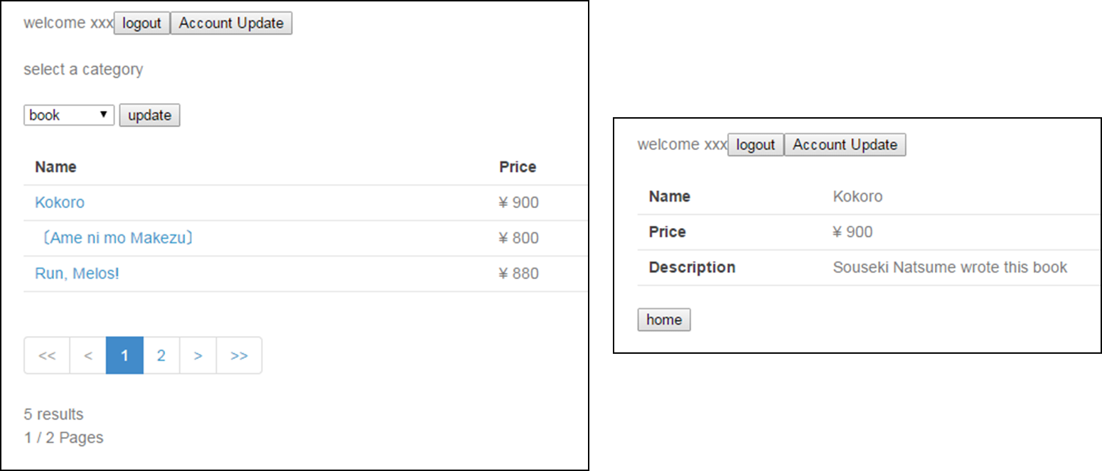 Login Pages ログイン機能(作成済み) Account Create Pages アカウント作成機能(作成済み) Account Update Pages アカウント情報変更機能 Item View Pages 商品一覧表示機能(作成済み)商品詳細表示機能(作成済み)カートアイテム登録機能 Cart View Pages カートアイテム削除機能 Order Pages 商品注文機能